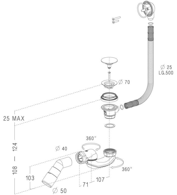 A dugó és a leeresztő szelep krómozott sárgarézből készül, hogy kellően erős és tartós legyen. A dugó fedelének átmérője 70 mm. A lefolyó hossza 650 mm. Olyan standard kádakba és mély tálcákhoz ajánljuk, ahol a lefolyó kimeneti nyílásának átmérője 50 mm. Lefolyócső átmérője: 40/50 mm Minden Korfu tálca árában benne van a komplett B602R leeresztő szifon.