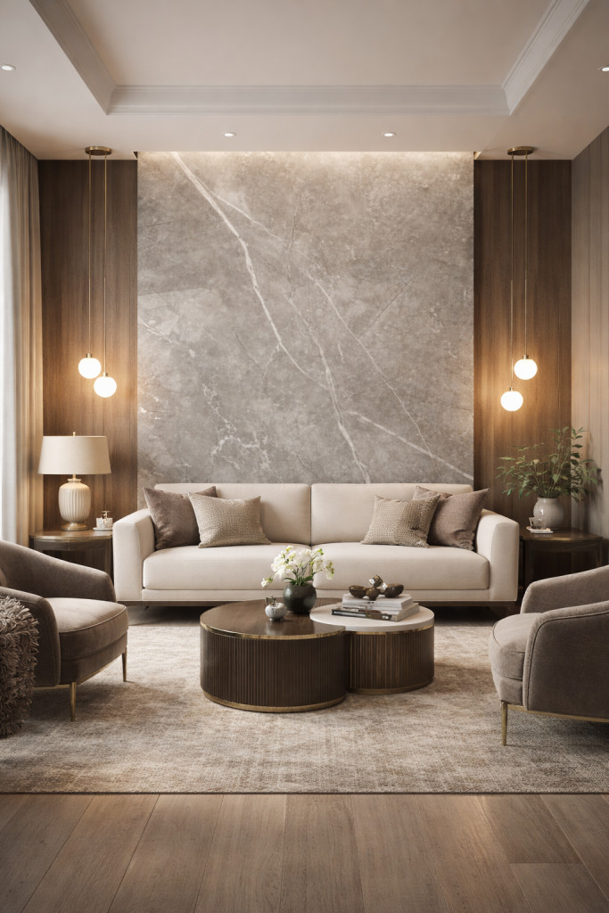 - Teljes falfelület burkolása nappaliban