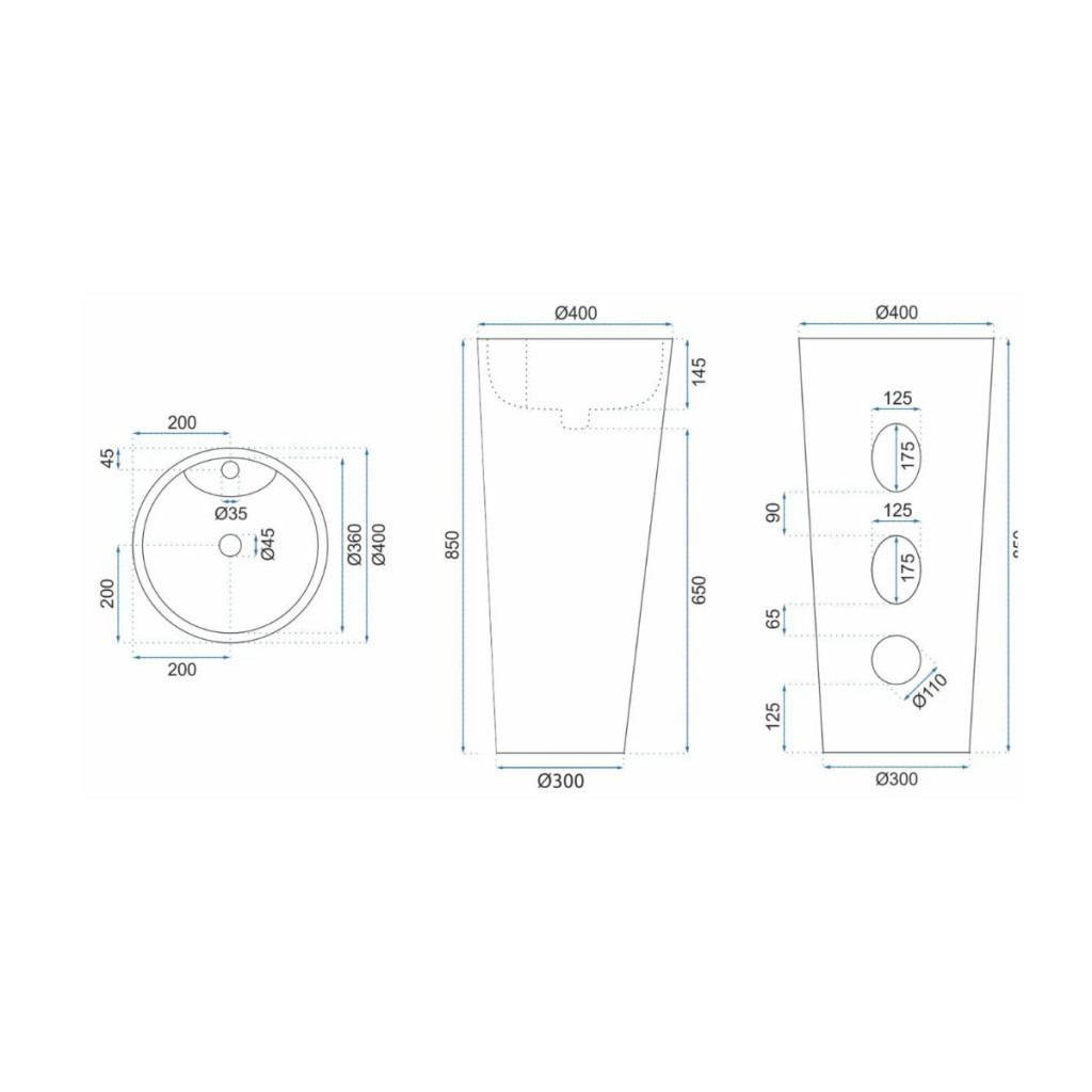 A Blanka szabadonálló mosdót a legújabb technológiák alapján fejlesztették ki. Anyagának köszönhetően rendkívül könnyedén tisztítható és tartós. Eleganciájának köszönhetően időtlen divatot és trendet teremt fürdőszobájába. Tegye különlegessé fürdőszobáját fekete szaniterrel! Szín: Fekete Mosdókagyló hossza: 410mm Mosdókagyló szélessége: 410mm Mosdókagyló magassága: 840mm Mosdókagyló mélysége: 145mm Anyaga: Szaniter kerámia Csaptelep szerelési lyuk: 35mm Túlfolyó nyílás: igen A lefolyó átmérője: 45mm