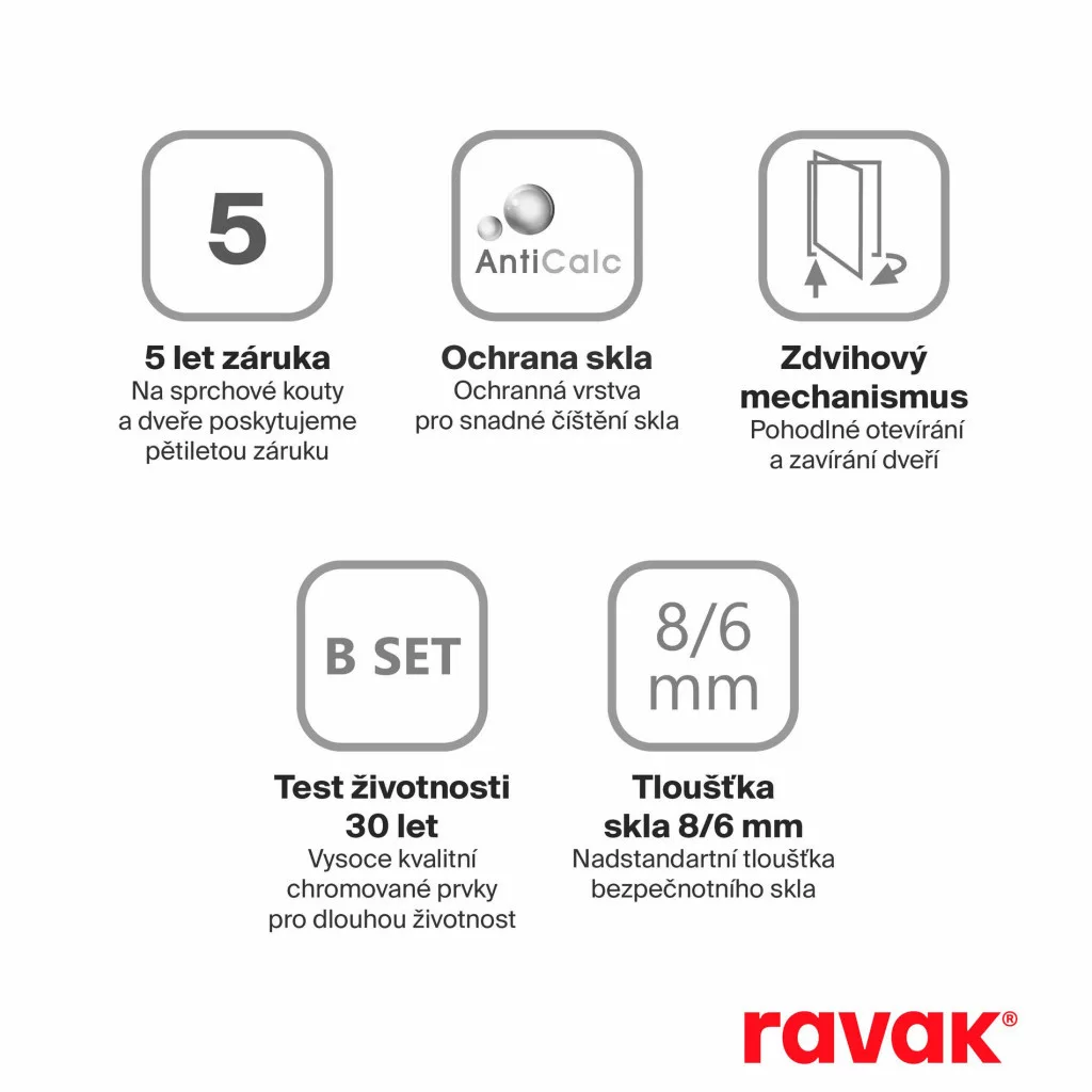 A termék két részből áll, amelyek közül az egyik a nyílóajtó. Az emelőmechanizmus biztosítja az ajtó alapállásban történő automatikus zárását, valamint a küszöb feletti emelését nyitáskor. A termék bal vagy jobb oldali változatát a nyílóóajtók zsanérjainak- külső nézetben történő - elhelyezkedése határozza mag. A termék a fürdőszoba burkolt sarkába, a Ravak Perseus, Perseus Pro, Perseus Pro Flat, Perseus Pro Chrome, Perseus Pro 10°, Gigant Pro, Gigant Pro Flat, Gigant Pro Chrome, Gigant Pro 10° zuhanytálcákra vagy közvetlenül a padlóra telepíthető zuhanyfolyókával, padlóösszefolyóval. A BSD2 zuhanyajtókat a következő összetételben szállítjuk: egyik csomagban az üveglapok, másik csomagban (B SET) a fém alkatrészek találhatók. Mindkét termékrészt külön kell megrendelni (üveg + B SET). Minden tételt megtalál az árlistánkban.