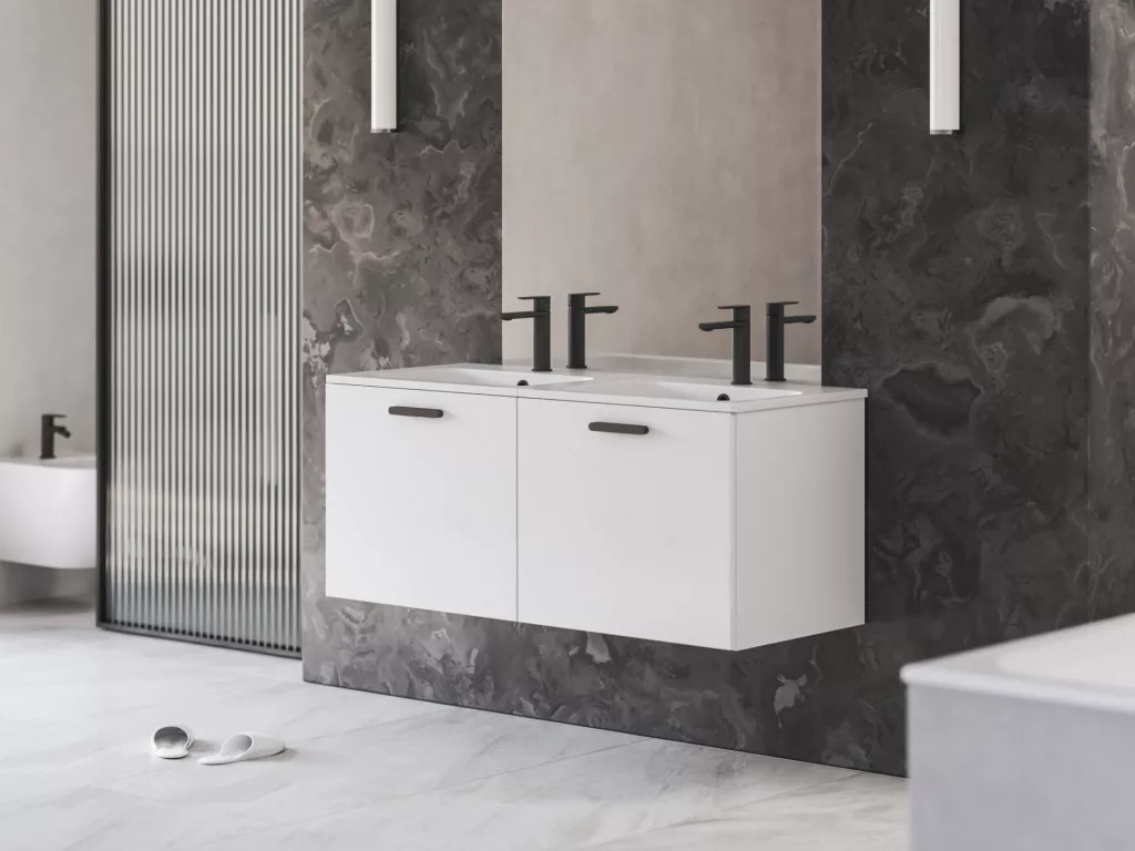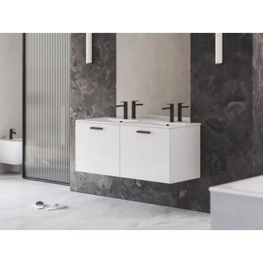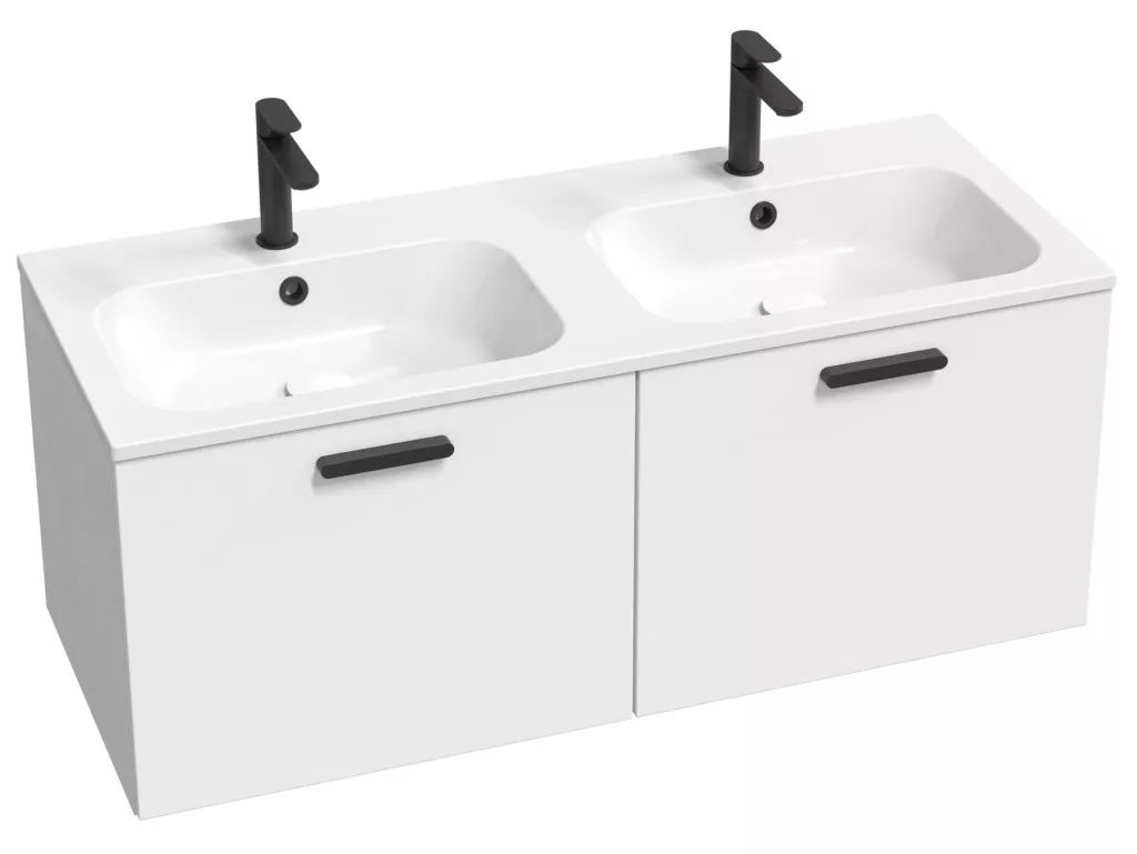 D Chrome II 120 két fiókos mosdó alatti szekrény (belső magassága 40 cm). A szekrény jobb oldali részében egy integrált, alacsony fiók található. A bal oldali részében pedig a 40 cm magasságú fiók található. A szekrény bal oldali részében nyílások találhatók az alacsony fiók későbbi beszereléséhez, amelyet utólag is megvásárolhatunk vagy áthelyezhetünk a jobb oldali részből. Az ajtókat fényes fehér színben, a fogantyúval a választott színárnyalatban, már összeszerelt állapotban szállítjuk, beleértve a szerelőkészletet (csavarok, zsanérok) és a fogantyút.