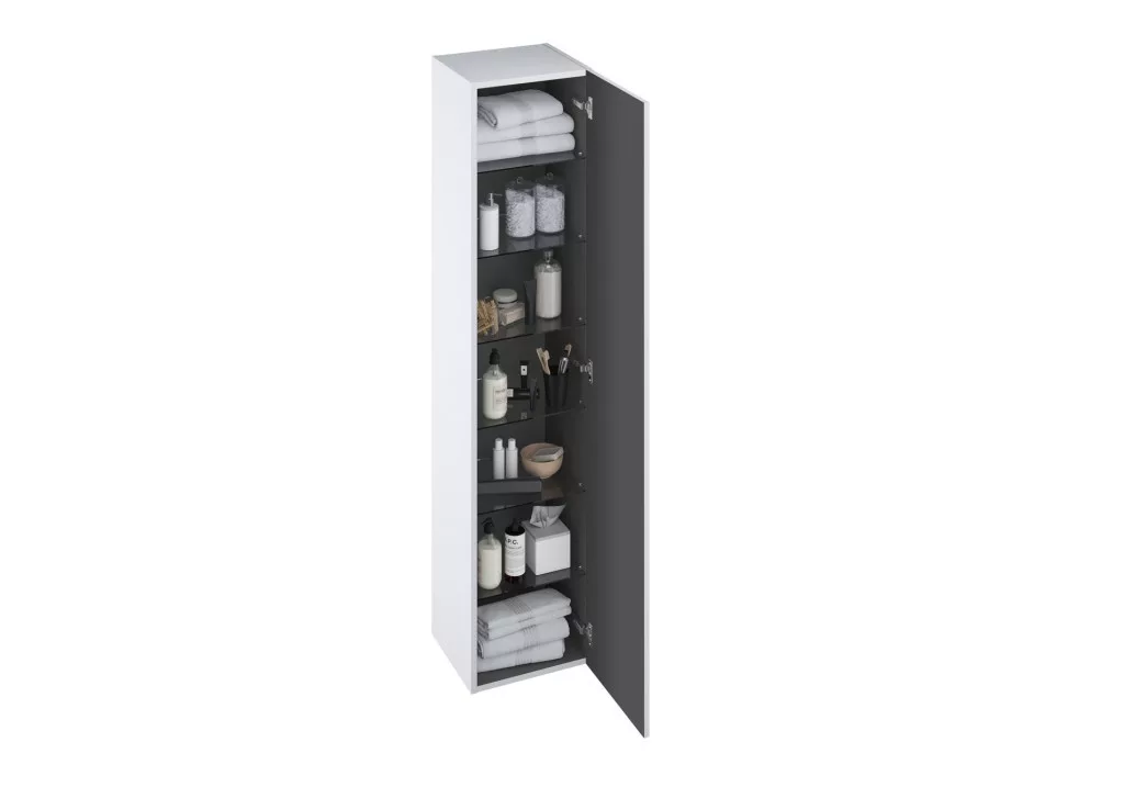 SB Comfort 35 magas szekrény hat füstös üvegpolccal. A szekrény belső tere grafit színű. A szekrény fehér fém fogantyúval szállítjuk. További változatként króm kivitelű fogantyút kínálunk, amely külön megrendelhető.