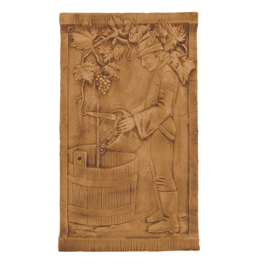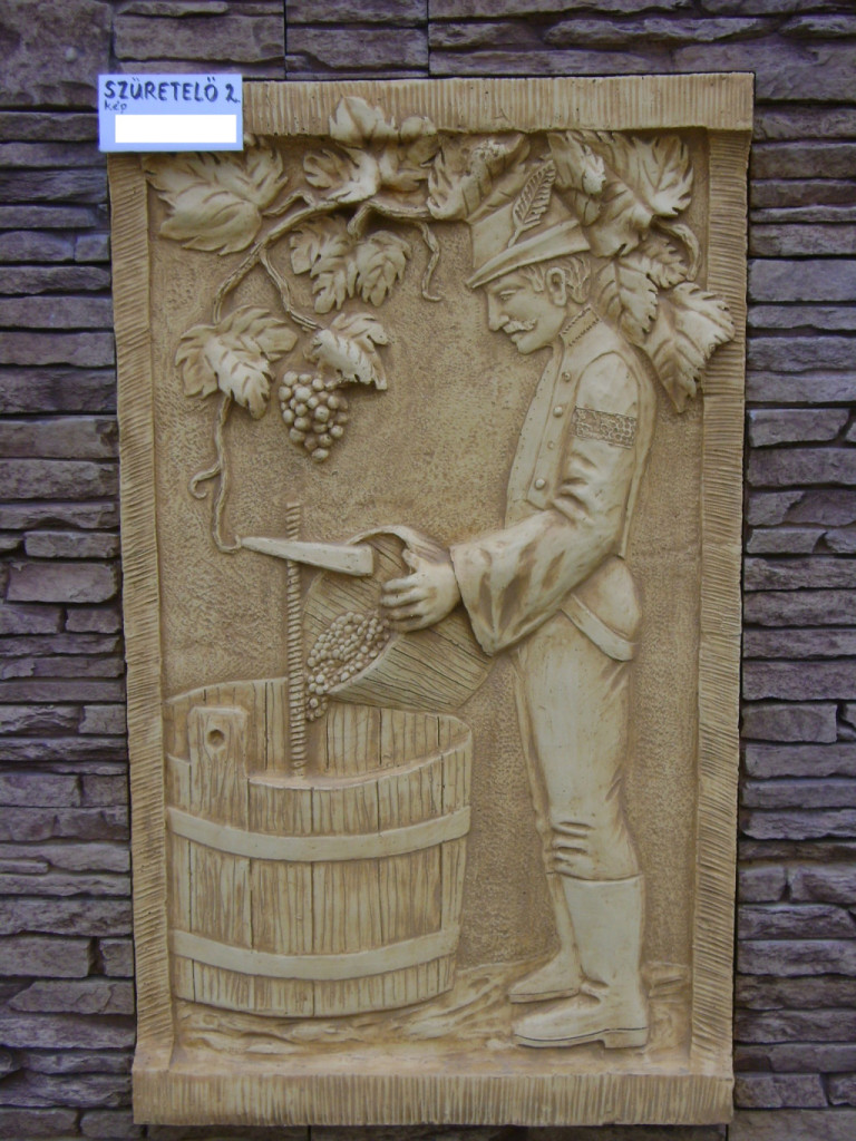 Szüretelő férfit ábrázoló fali kép, falburkolatba illeszthető, de önálló dekorációként is felhasználható. A termék anyaga lehet gipsz vagy beton, attól függően, hogy kültéri vagy beltéri felhasználásra vásárolja, ezt megrendelés esetén kérjük írja a megjegyzés rovatba! A gipsz anyagból készült termék csak beltéri használatra, a beton anyagból készített dekoráció pedig kül és beltéri helyiségek dekorálására is alkalmas. Magassága: 92 cm Szélessége: 54 cm Vastagsága: 6,5 cm A szüretelést ábrázoló kép rendelhető a Fabro gyártó által készített falburkolatok színeiben is! Doboz tartalma: 1 db/ 31 kg/ doboz