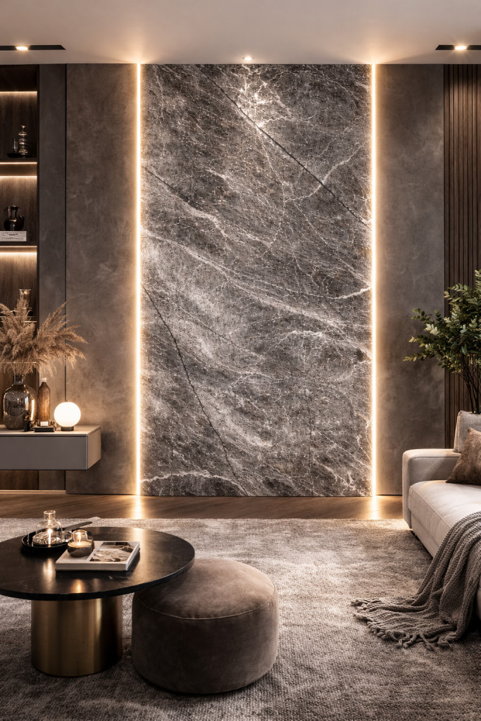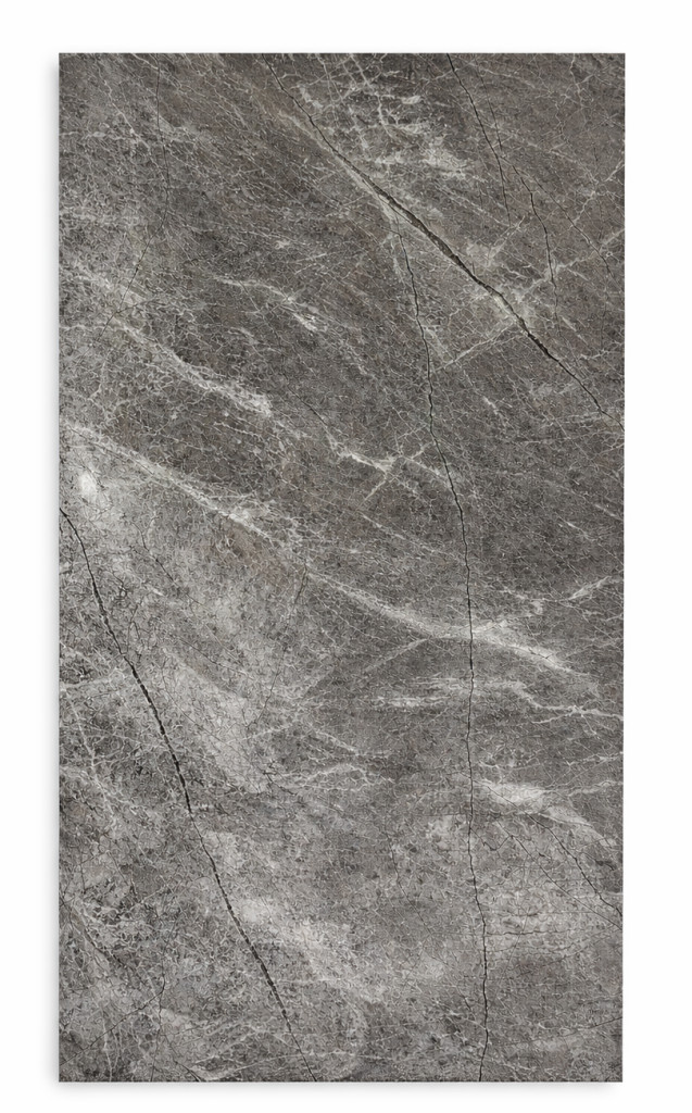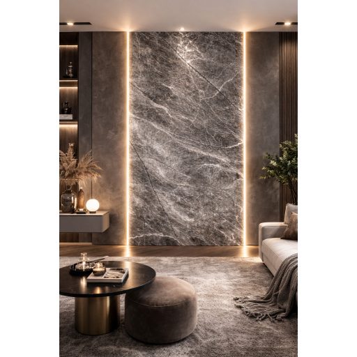 A sötétszürke árnyalat mélységet és eleganciát ad a térnek, miközben a finom erezet természetes, kőhatású megjelenést biztosít. Oldalsó LED csíkokkal kombinálva modern, exkluzív enteriőr alakítható ki, amely nappal visszafogott, este pedig hangulatos fényjátékkal emeli ki a felület struktúráját.