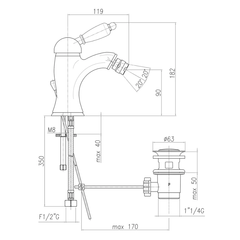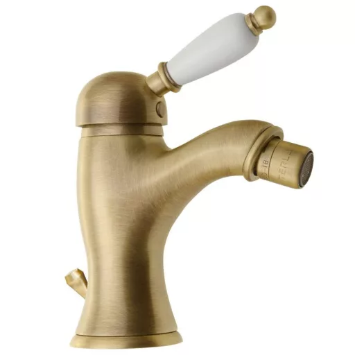 KIRKÉ bidécsaptelep, automata leeresztővel, fehér kerámia karral, bronz   Ez a KIRKÉ bronz színű bidécsaptelep  kiváló kiegészítője lehet klasszikus stílusú fürdőszobájának. Márkanév: Sapho Garancia: 72 hónap Súly: 2.14 kg Szín: Bronz Magasság: 182 mm Alapanyag: Réz Kartus átmérő: 42 mm Szerelés : Álló Kezelőkar: Karos Kivitel: Lefolyóval Forma: Retro