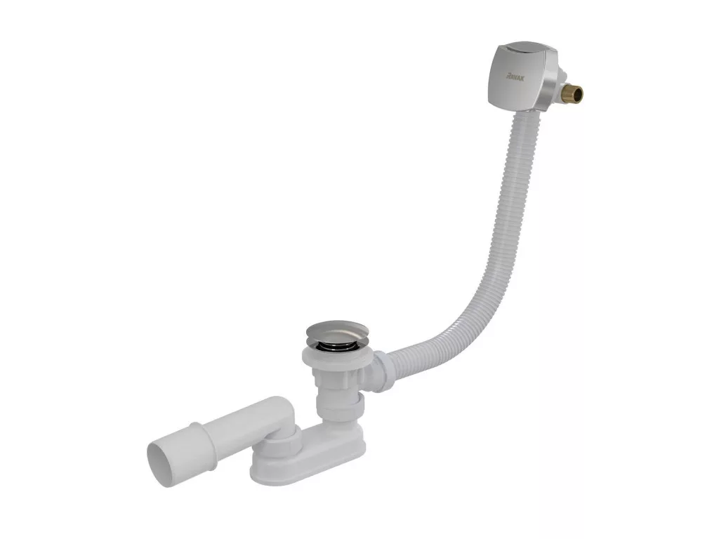 Fürdőkád lefolyó készletek túlfolyóval, 570 mm hosszúságban, a lefolyó vezérlése a Click-Clack dugó lenyomásával. A termék tartalmazza a szifont (szagelzárót), a fém szifon dugót és a műanyag töltőfejet. A lefolyó vezérlése négyzet alakú, króm felületkezeléssel.