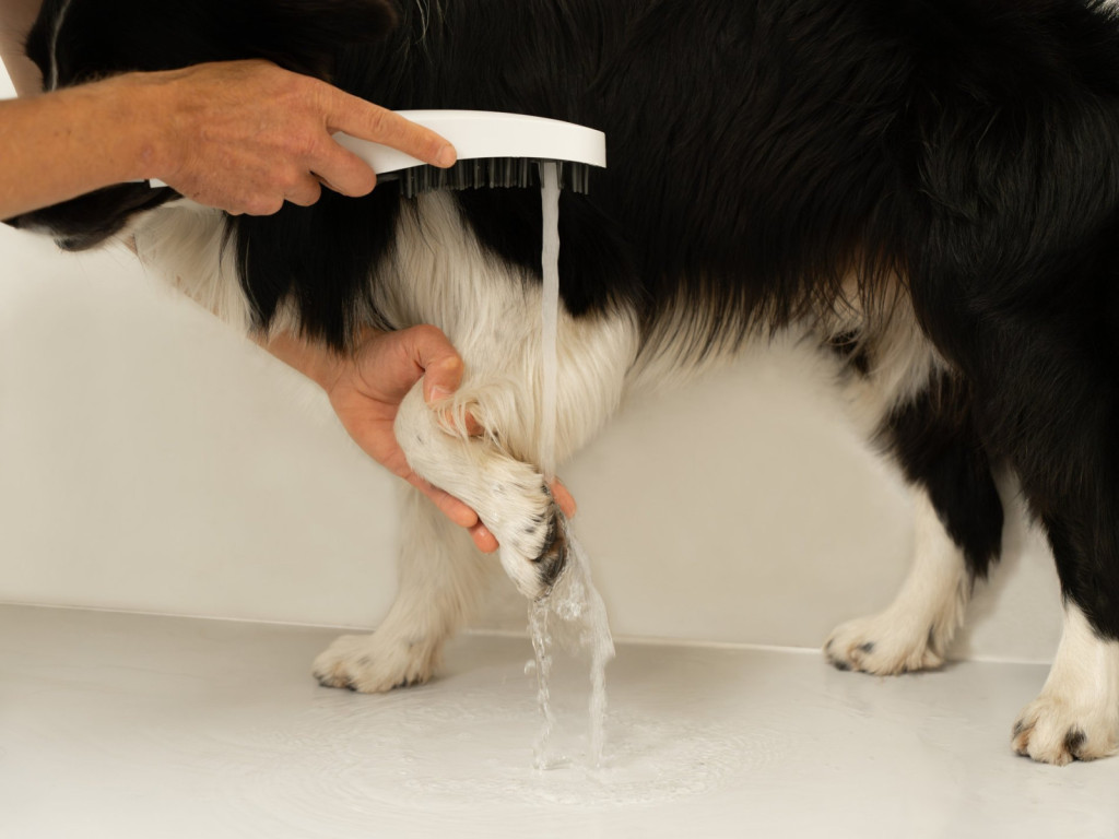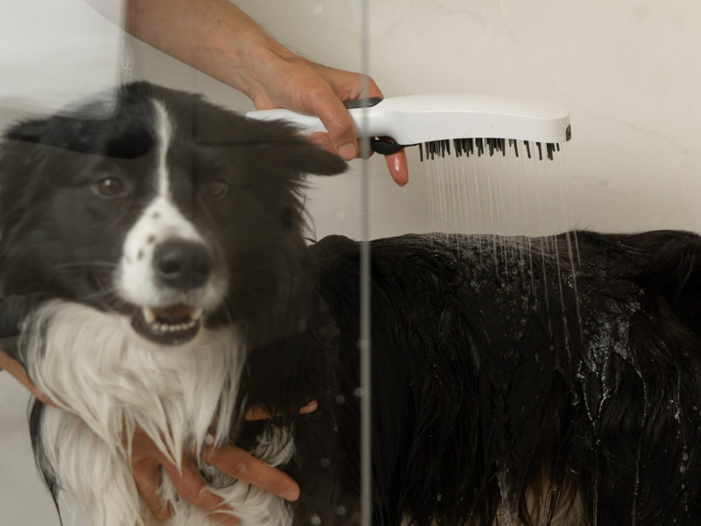 A rugalmas szilikon kefe könnyedén kifésüli a szőrzetet, felhabosítja a sampont és eltávolítja a szennyeződéseket. A kézi zuhany 4 vízsugár üzemmódot kínál, amelyeket könnyedén válthatsz forgatókarral vagy gombbal. A Rain sugár rendkívül kíméletes, különösen alkalmas a fül és a szem környékének érzékeny részeihez. A Soft sugár gyengéd, ugyanakkor elég erős a sampon felhabosításához és kiöblítéséhez. A perlátorral ellátott, levegőztetett sugár célzott és takarékos, ideális a mancsok, a has vagy az alsó testfelületek mosásához felesleges fröcskölés nélkül. Az elülső nyomó fúvóka, amelyet a hátoldalon található külön gombbal lehet vezérelni, hatékonyan eltávolítja a makacs szennyeződéseket, például a rászáradt sarat.