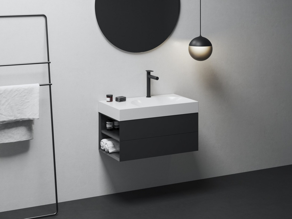 Lite 80/60 mosdó bal oldalon tárolórésszel. A mosdó nincs túlfolyóval ellátva, ezért fix mosdólefolyó alkalmazása szükséges, amely megakadályozza a víz túlfolyását. A mosdón előre fúrt lyuk van a talapzaton lévő mosdócsaptelep számára. A szerelőkészletet (csatlakozódugók, csavarok stb.) a csomagolás tartalmazza. A falra szerelhető vagy kiegészíthető az SD Lite 80 vagy SD Lite 80 bal alatti szekrénnyel.