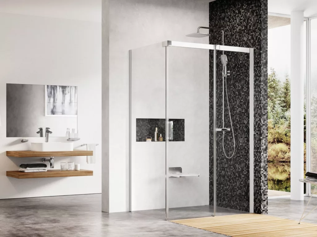 A termék egy kétrészes zuhanyajtóból (egy fix és egy mozgatható rész, amely egy tolóajtót alkot) és egy fix falból áll. A fürdőszoba csempézett sarkába, közvetlenül a padlóra telepíthető zuhanyfolyókával vagy padlóösszefolyóval.