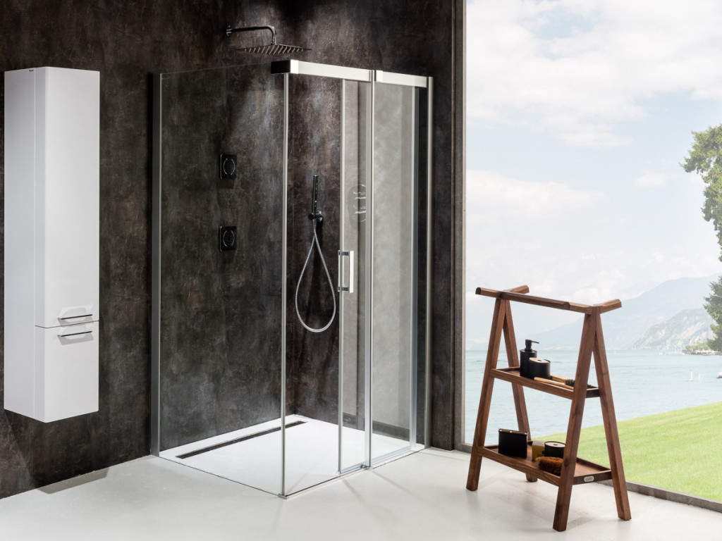 A termék egy kétrészes zuhanyajtóból (egy fix és egy mozgatható rész, amely egy tolóajtót alkot) és egy fix falból áll. A fürdőszoba csempézett sarkába, közvetlenül a padlóra telepíthető zuhanyfolyókával vagy padlóösszefolyóval.