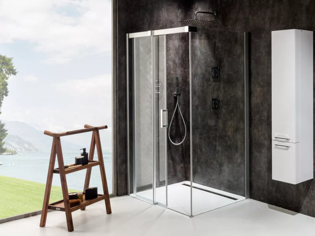 A termék egy kétrészes zuhanyajtóból (egy fix és egy mozgatható rész, amely egy tolóajtót alkot) és egy fix falból áll. A fürdőszoba csempézett sarkába, közvetlenül a padlóra telepíthető zuhanyfolyókával vagy padlóösszefolyóval.