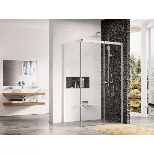 A termék egy kétrészes zuhanyajtóból (egy fix és egy mozgatható rész, amely egy tolóajtót alkot) és egy fix falból áll. A fürdőszoba csempézett sarkába, közvetlenül a padlóra telepíthető zuhanyfolyókával vagy padlóösszefolyóval.