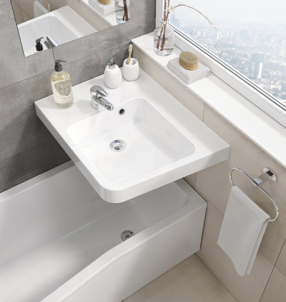 Az alacsony Click-Clack csaptelep alkalmas a BeHappy II mosdókagylóhoz és a bútorral rendelkező mosdókagylókhoz, ahol helyet takarít meg, és javasoljuk, hogy kombinálja bútor szifonnal.