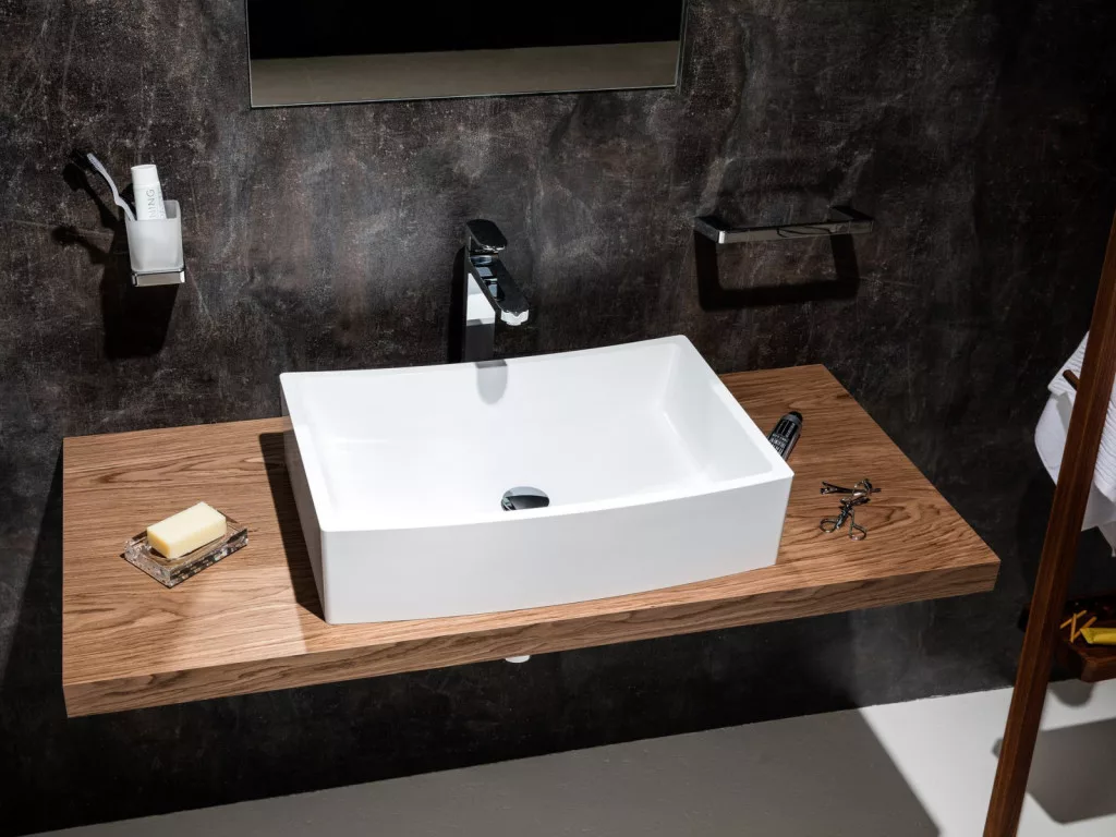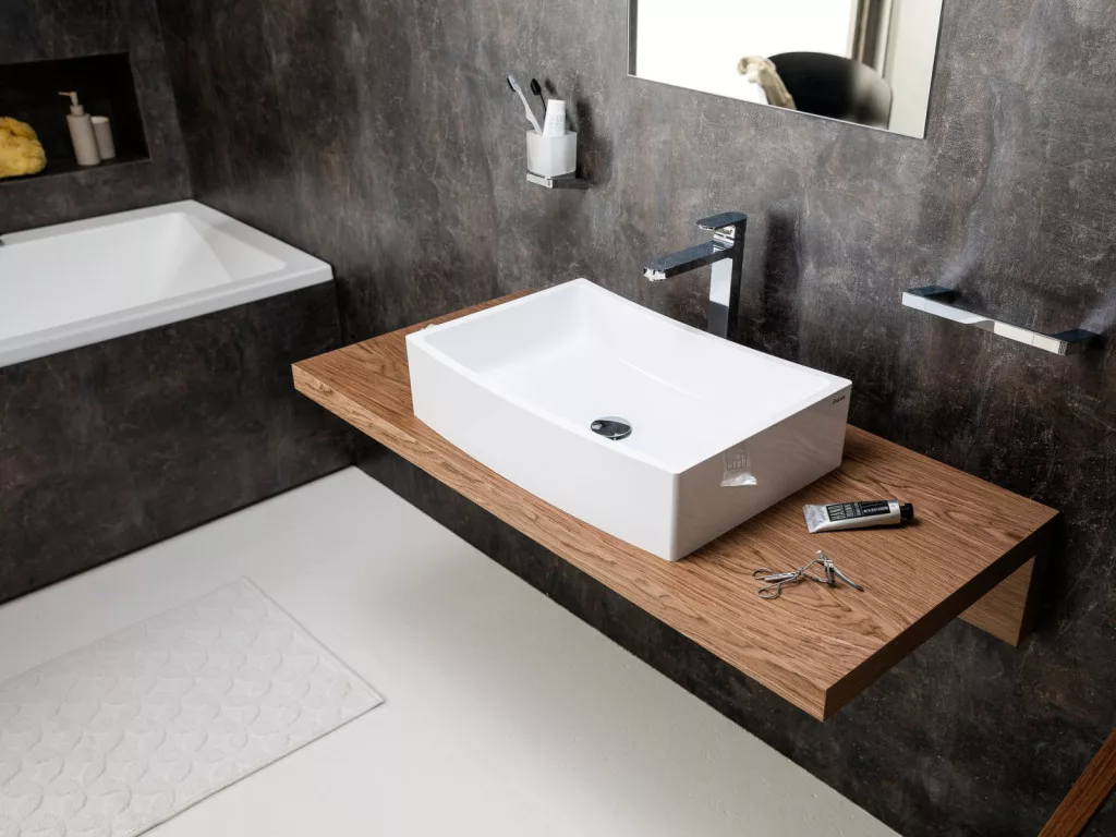 A különleges formájú pultlapot kifejezetten a Formy mosdókhoz tervezték. Speciálisan impregnált felületkezelés a nedvesség ellen, három szín- és anyagváltozatban kapható. A készlet erejéig.