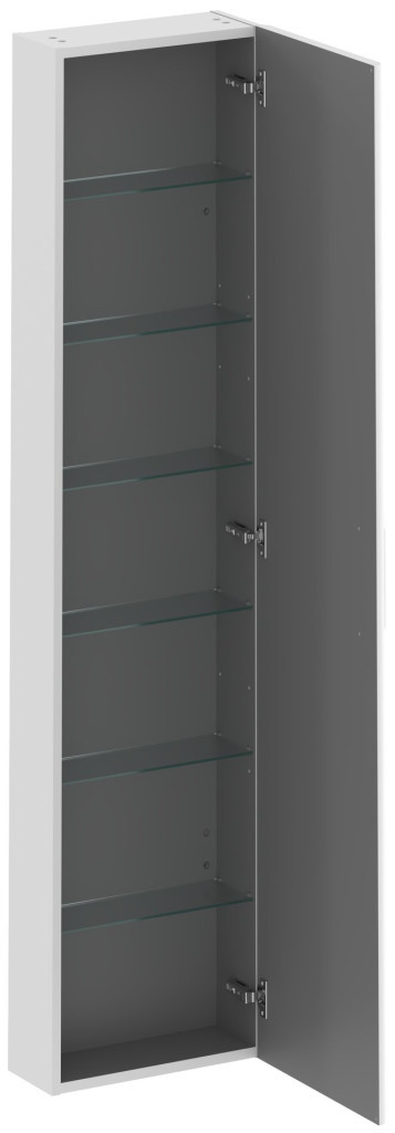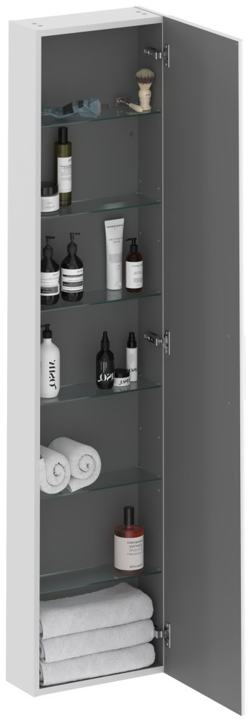SB Balance II 40 magas szekrény hat füstös üvegpolccal. A szekrényben van egy előre fúrt lyuk a fogantyúhoz, amely nem része a magas szekrénynek, és külön meg kell vásárolni. Három színben kapható: fényes króm, fekete vagy fehér.