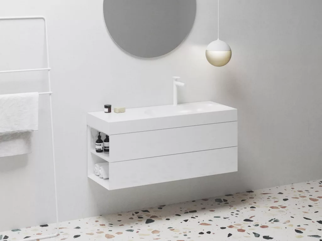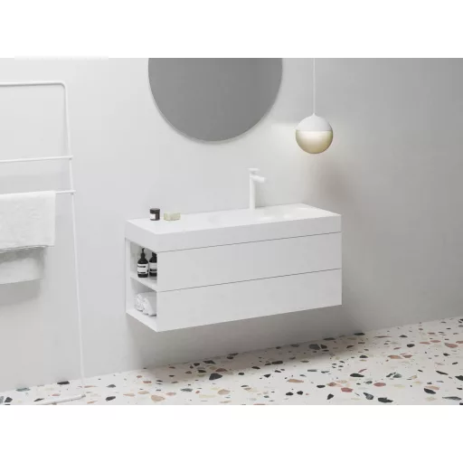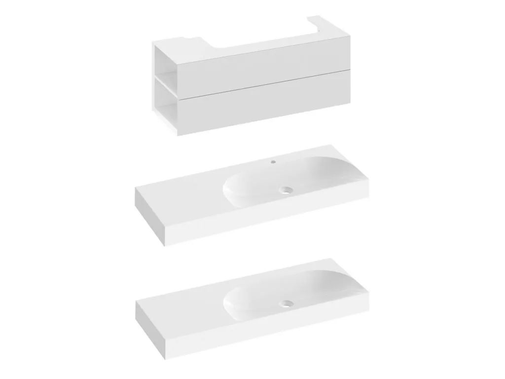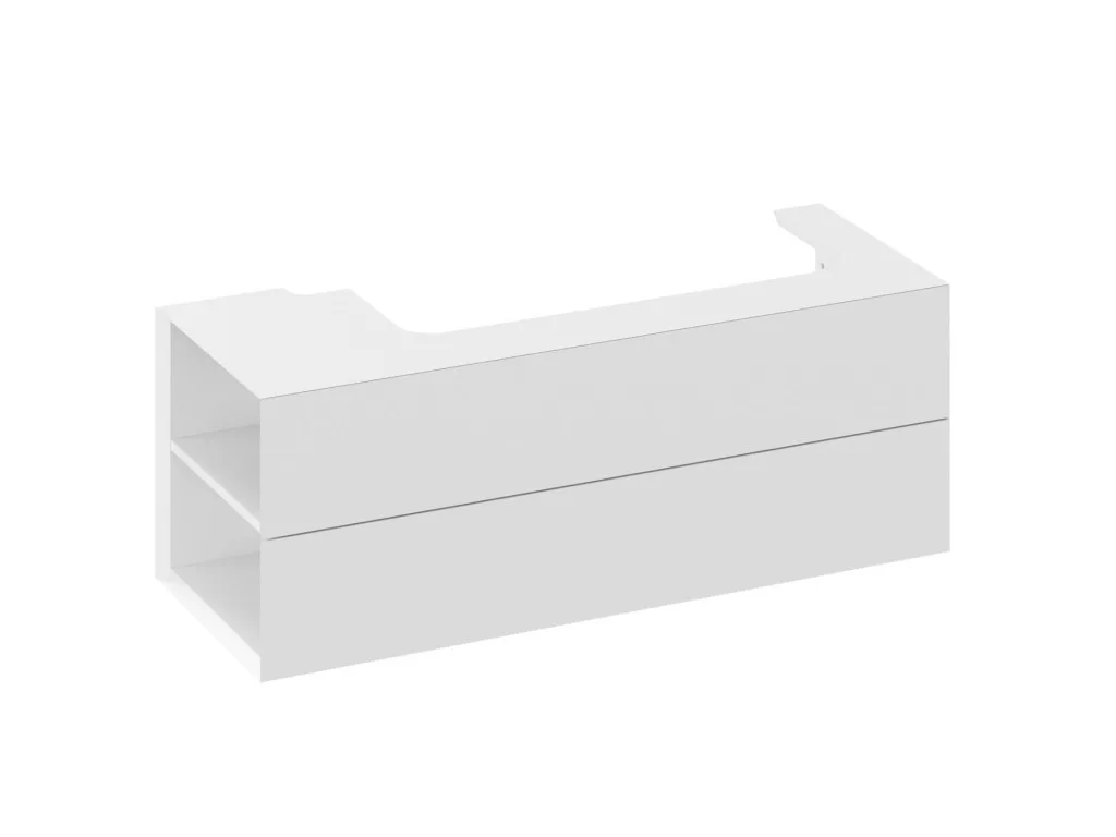 Az SD Lite 120 B-es mosdószekrény Lite 120/80 B-es mosdóhoz készült. Két első fiókkal és két oldalsó polccal van felszerelve. A szekrényfiók az elülső oldal szélének meghúzásával nyílik. Összeszerelve szállítjuk, beleértve a rögzítőkészletet (csavarok, zsanérok, zárósapkák). A szekrény a falra van szerelve.