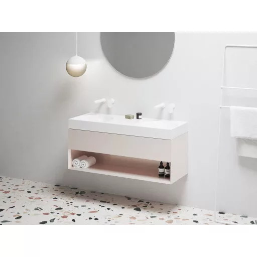 Az SD Lite 120 mosdószekrény Lite 120, Lite 120/80 B/J és Lite 120 duplamosdóhoz készült. Elülső fiókkal és polccal van felszerelve. A szekrényfiók az előlap alsó szélének meghúzásával nyílik. Összeszerelve szállítjuk, beleértve a rögzítőkészletet (csavarok, zsanérok, zárósapkák). A szekrény a falra van szerelve.