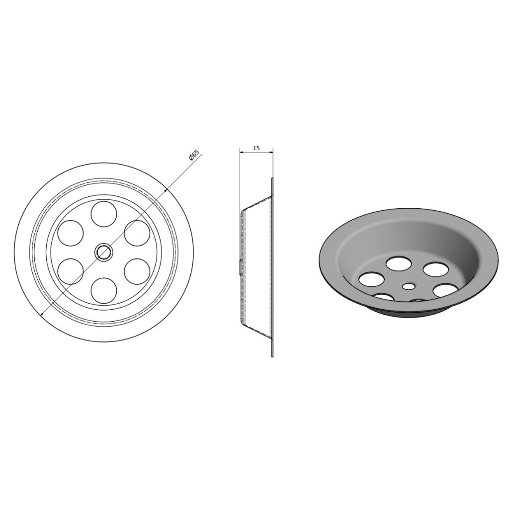 Inox anyagból készült lefolyó tálka, 65mm-es átmérővel, amely kompatibilis minden Sapho mosdóval.