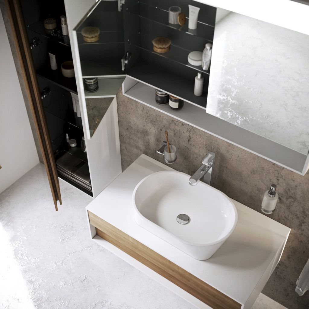 A fürdőszoba komplex kialakításához és a kivitelezésben való összehangoláshoz javasoljuk, hogy az SB 430 Step fali szekrény a Step termékcsalád többi termékével legyen kombinálva (MC 1000 Step tükrös szekrénnyel, SD 1000 Step mosdó alatti szekrénnyel).
