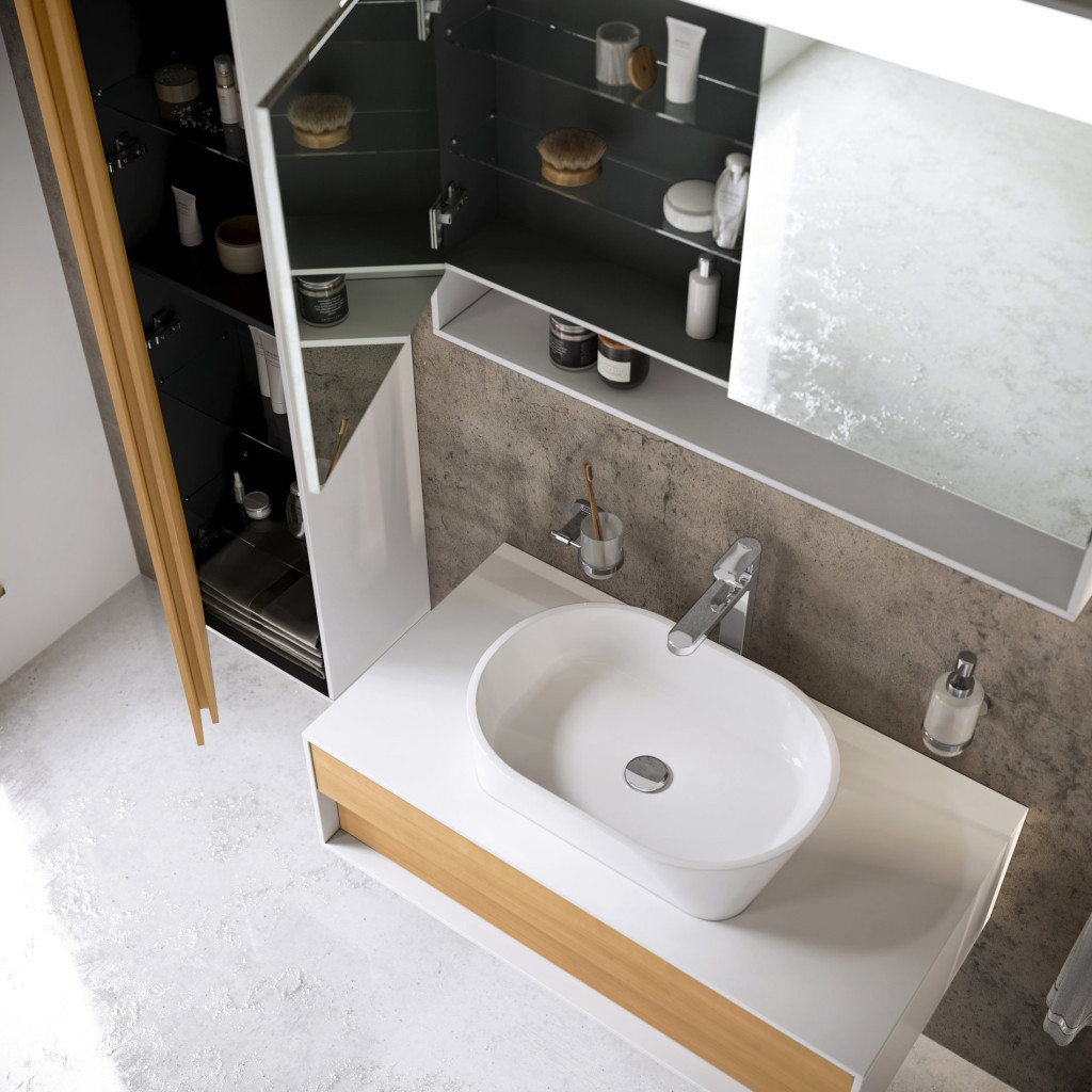 Egységes megoldás és a fürdőszoba design összhangjának érdekében javasoljuk a SB 430 Step magas szekrényt kombinálni a Step sorozat többi termékével (MC 1000 Step tükörszekrény és SD 1000 Step mosdó alatti szekrény).
