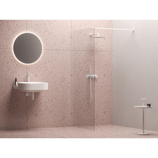 A Walk-In Wall zuhanykabin 8 mm vastag edzett biztonsági üvegből áll. A termék stabilitását egy fém merevítő biztosítja, amely meghatározza a belépés szélességét. A Walk-In Wall zuhanykabin fehér fém alkatrészekkel rendelkezik. Javasoljuk burkolt fürdőszoba sarokba történő telepítését, közvetlenül a padlóra, beépített padlóösszefolyóval vagy zuhanyfolyókával. A zuhanykabin univerzális, a beszereléskor választható jobb vagy bal oldali belépés. A csomag tartalmaz egy fix üvegfalat beállító profilt, fehér kivitelben.