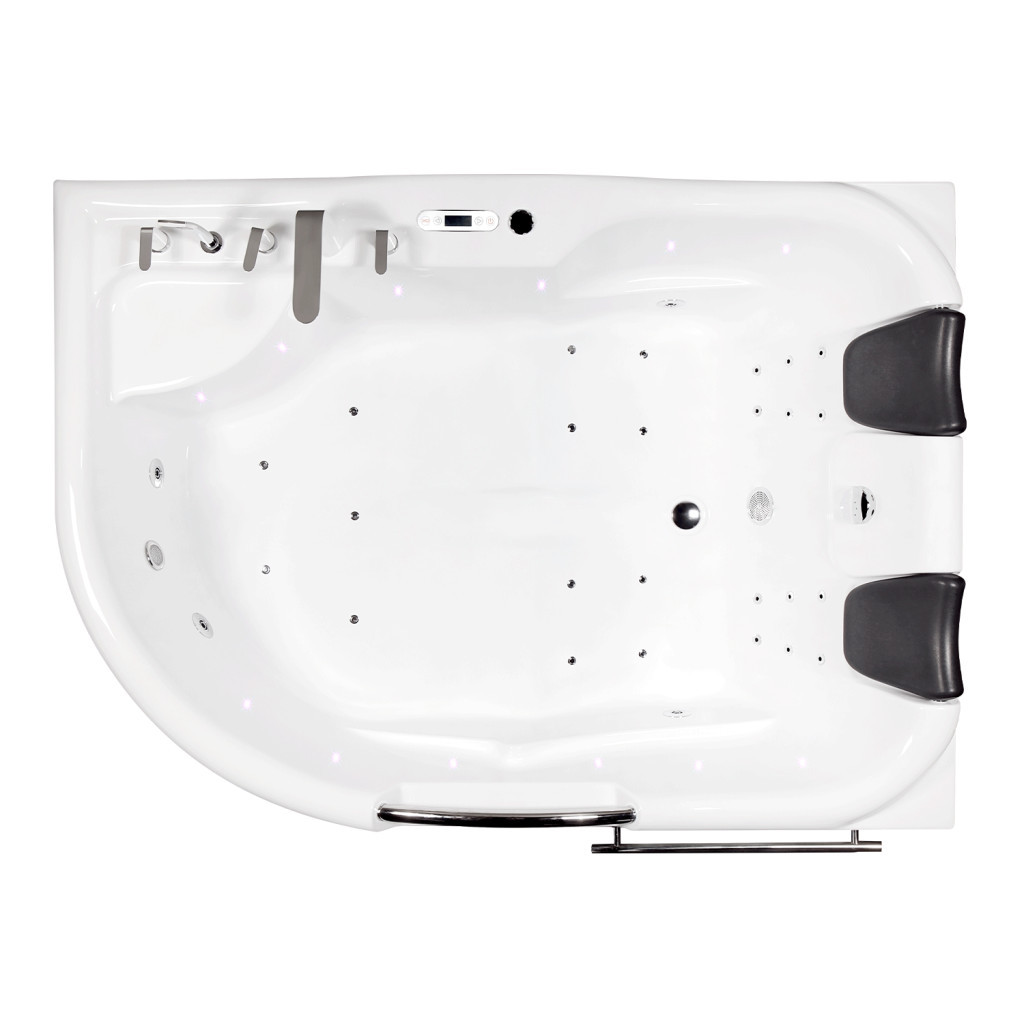 A 330 literes vízmennyiséggel bíró, két személyes aszimmetrikus kádunk alapcsomagja is már számos felszereltséggel rendelkezik: krómozott kapaszkodó, keretes lábszerkezet, két darab felhajtható fejpárna is a felhasználói élmény fokozását szolgálja. Rendelje jobbos vagy balos kivitelben és tegye exkluzívvá fürdőszobáját ezzel a lenyűgöző látványt nyújtó káddal. Mechanikus vezérlésű masszázsrendszerrel felszerelve.