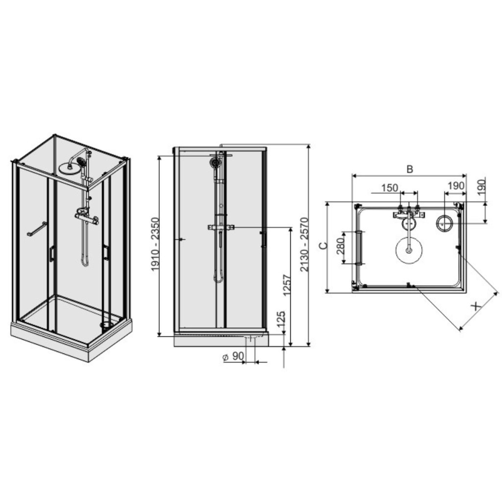 A szett tartalma: kabin, tálca, láb, szifon, zuhanyszett, termosztátos csaptelep, kapaszkodó, szappantartó