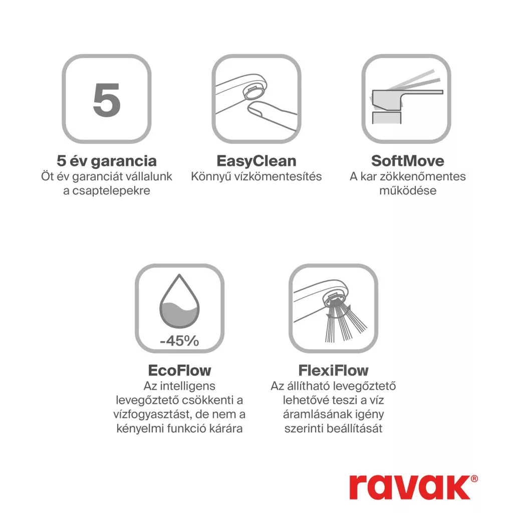 A csaptelep belsejében található egy EcoFlow funkciójú perlátor. A vízáramlás 5 liter/percre korlátozódik és levegővel dúsított. Valószínűleg észre sem veszi, de a vízfogyasztásán látszik majd, amely alacsonyabb lesz, mint a hagyományos csaptelepek esetében.